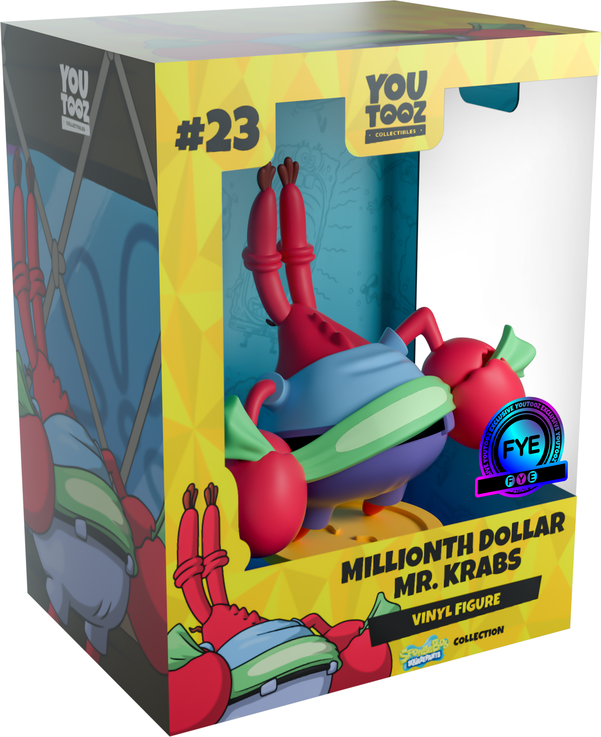 The Collectible “This is my one millionth dollar earned!” Ok, no need to brag! Well ok, you can brag a little! And that’s just what Mr. Krabs intends to do with his brand new Youtooz figure! Leaning forward to stand at 4.2 inches tall with closed eyes and a joyous open smile that reveals his pink tongue, he grips a long stretched green dollar bill in his large claws which he uses to rub across his backside. Dressed for business (which is everyday!), he wears a short sleeve blue shirt with purple pants that are held up with a thick black belt as his thin legs are planted to the ground. The exterior of his packaging sees Mr. Krabs standing in an empty Krusty Krab celebrating the only way you should after getting your one millionth dollar, while the interior is an ocean blue gradient collaged with illustrations of SpongeBob. The protective sleeve is then printed with SpongeBob’s bright yellow triangular pattern as his figure can be seen through the large clear window at its front. This collectible ships in a matte, embossed, protective outer sleeve and a custom sized plastic protector for maximum protection during shipping. About SpongeBob SquarePants SpongeBob Square Pants or simply known as SpongeBob, is an American animated, surreal comedy TV show created by marine science educator and animator Stephen Hillenburg aired by Nickelodeon. The hilarious adventures of the characters take place in an underwater town called the Bikini Bottom deep in the Pacific Ocean. © 2024 Viacom International Inc. All Rights Reserved. Nickelodeon, SpongeBob SquarePants and all related titles, logos and characters are trademarks of Viacom International Inc. SpongeBob SquarePants created by Stephen Hillenburg.